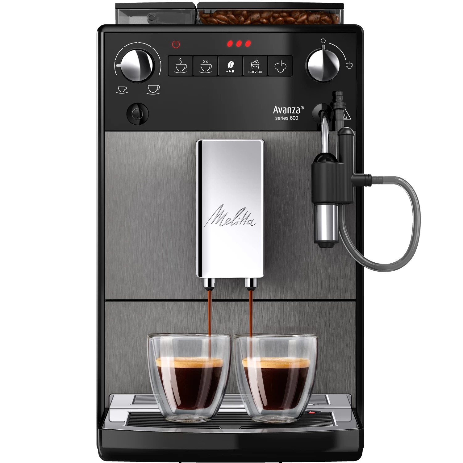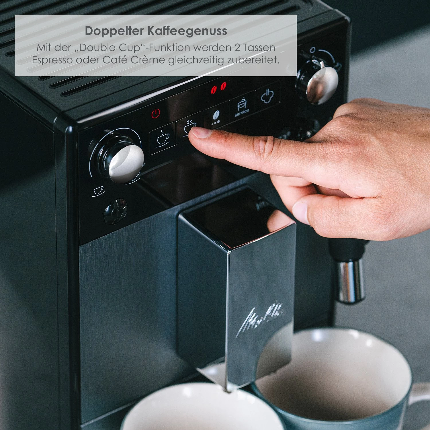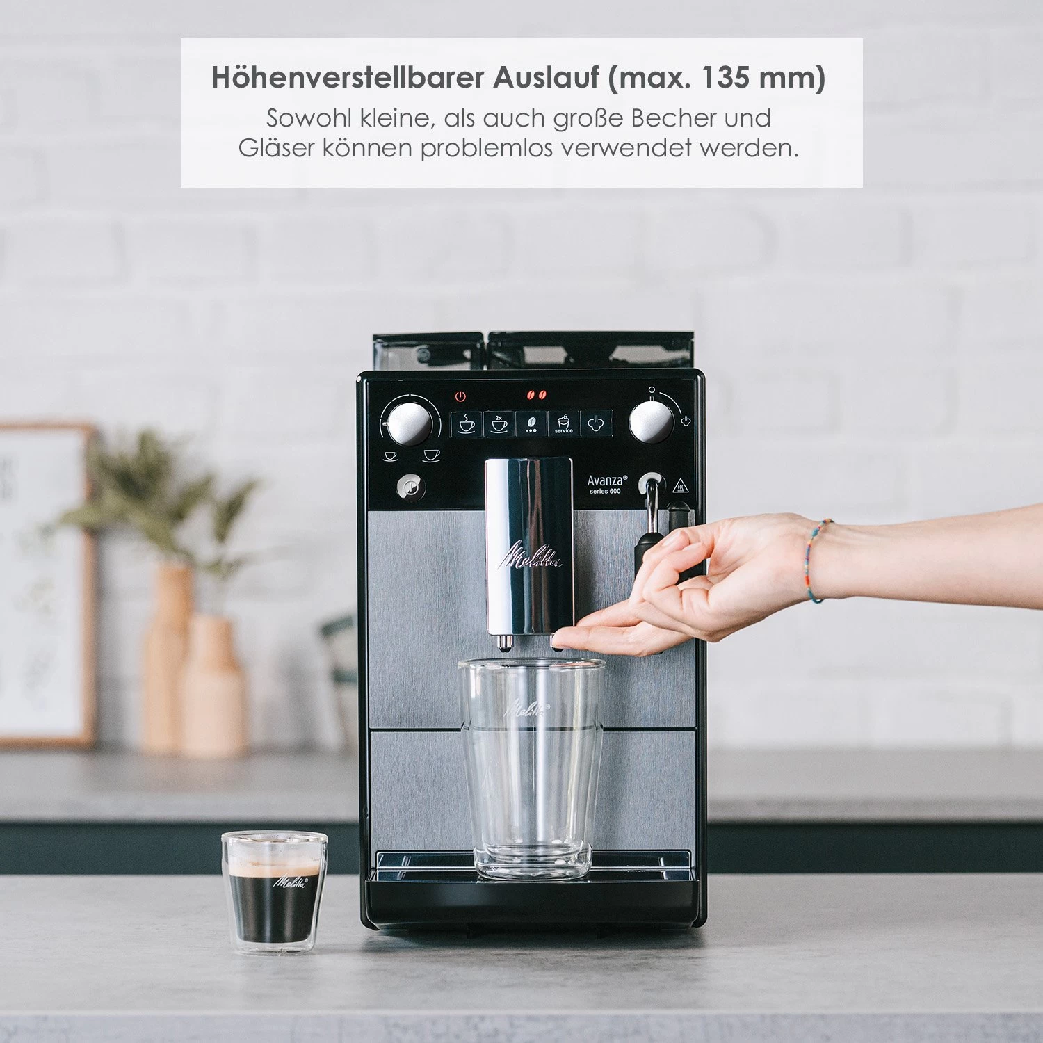Die Melitta® Avanza® steht für puren Kaffeegenuss und platzsparendes, zeitloses Design. Die gewünschte Kaffeespezialität und Kaffeestärke lassen sich einfach über die Direktbezugstasten auswählen. Für XL-Kaffeevergnügen sorgen der extragroße Wassertank, der 250-g-Bohnenbehälter und die „Double Cup“-Funktion, mit der sich zwei Tassen Kaffee gleichzeitig zubereiten lassen. Mit unserem Easy Cappuccinatore lassen sich auch Kaffee-Milch-Getränke in nur zwei Schritten zubereiten: Milch aufschäumen, Kaffee beziehen, genießen.