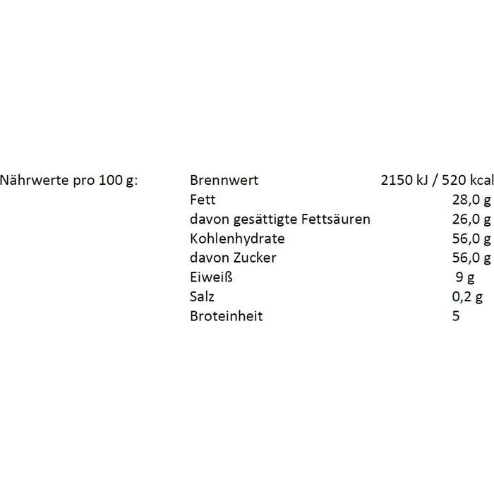 Glukosesirup, pflanzliches Fett (Kokosnuss) ganz gehärtet 27,6%, MAGERMILCHPULVER 20%, MILCHEIWEIß 2%, Stabilisator (E340), Emulgatoren (E471, E472e), Trennmittel (E551)