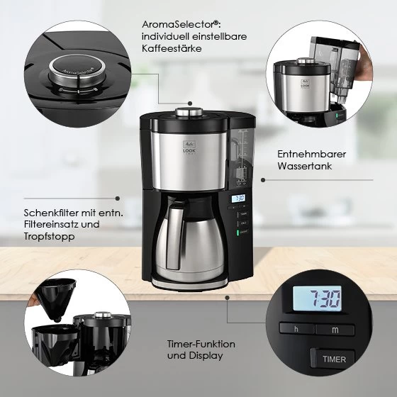 Die Melitta® LOOK® Therm Timer sorgt für langanhaltenden Kaffeegenuss zum gewünschten Zeitpunkt! Einfach Wasser, Kaffeefilter und Kaffeepulver vorbereiten, die Zeit einstellen und zum gewünschten Zeitpunkt entspannt eine Tasse Kaffee genießen. Und dank der doppelwandigen Edelstahl-Thermkanne bleibt auch die zweite Tasse zuverlässig warm und frisch.